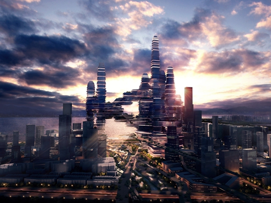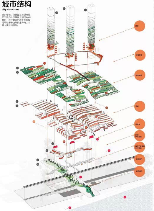 总体的概念是三栋塔楼,底部塔楼有各个超级总部办公空间,我们希望办公空间能够活动,同时能够相互组合,并且我们把整个超级城市里的绿色空间、公园和公共娱乐场所全部架设在空中。
