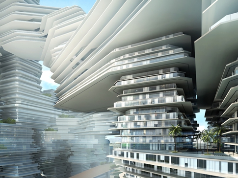 这是几张效果图,反映出一种动态。交通我们也考虑了,完全是三维立体的,海陆空完全交织在一起。我们上面做了非常多的直升飞机平台,海边上有码头,陆地有地铁、高速中转站,所以完全是海陆空高度枢纽型的综合体。