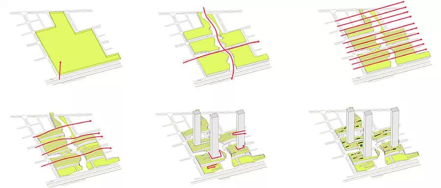 这是我们生长的逻辑,简单地说我们希望把用地范围变成绿色的绿毯,在此基础上把主要开放空间和道路空间切出来,然后把大量的多层通过街区尺度切出来,形成比较舒适的自然使用条件,多层本身从施工到维护各个方面都节能。进一步把它形成立体的地表,人可以从立面走到屋顶,形成真正意义上的屋顶公园。最后才是塔楼,我们算了这三个塔楼基本可以满足容积率的要求,我们最初朴素的愿望就可以实现了——虽然是密度很高的超级城市,但是最后给城市的印象是很稀的、压力很小的东西。