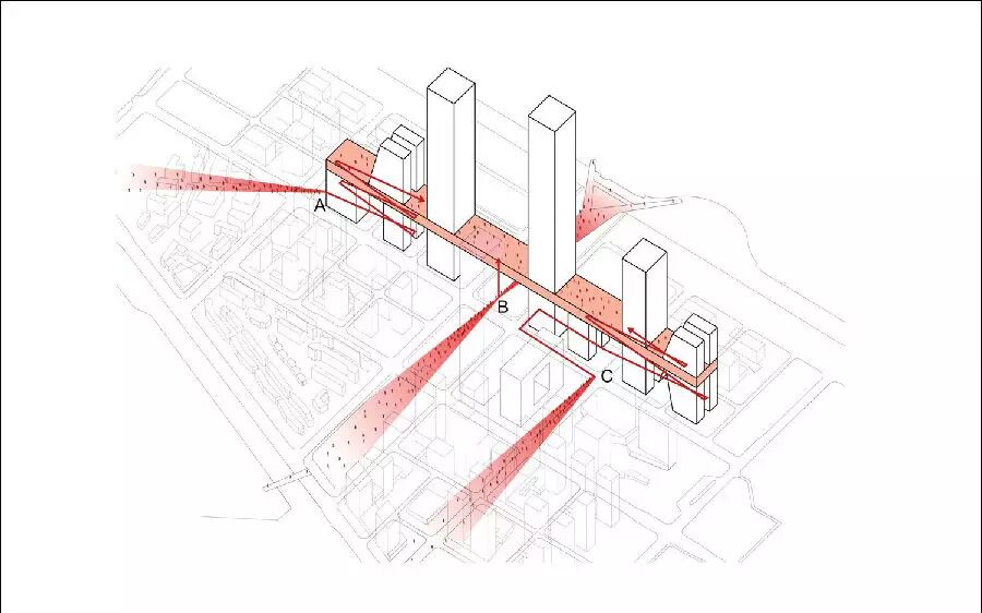 上图可以看出整个片区的人流组织关系,从不同的方向通向空中街道。