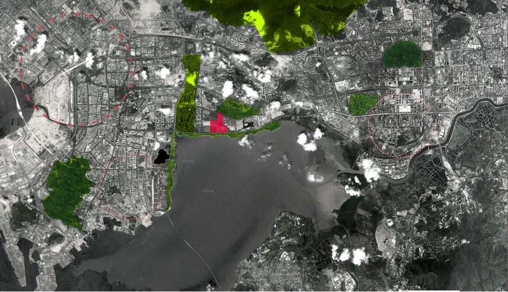 深圳给我的印象是自然生态非常优异的一个城市,南面是海、北边是山,横向展开,有很多城市中间的绿肺,在南北向有比较典型的大的绿肺,罗湖不用说,逐渐过来以笔架山公园和莲花山公园形成的短暂的绿洲,以华侨城腹地形成的中央绿肺,以沙河高尔夫形成的大片绿色,我觉得这是深圳特别好的地方。是不是可以把用地最大化的利用起来,形成连接北部侨城湿地和南部深圳湾的一个最大化的公园,这就是我们非常简单的一个思路。