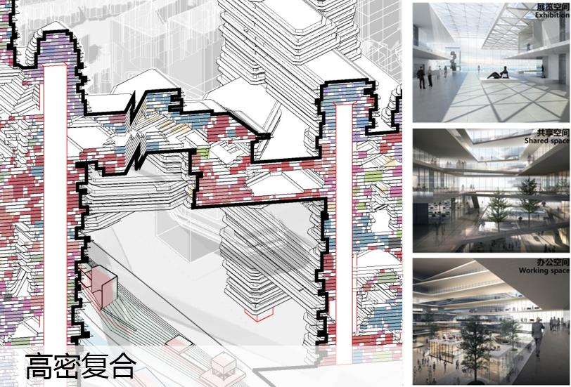 超高层本身和多层之间形成广场,但是在有些地方是把路面连起来,在地面形成比较充分的空间。还有几个点是所谓的热点,地铁站和人流密集的地方做比较疏松的处理。超高层实际上实现的密度很低。如果我们把覆土充分利用好的话,真正严格意义上的覆盖是超高层的覆盖,当然这个地方再进一步推敲怎么实现立体公园,就是怎么把建筑和覆土、和生态有机结合。