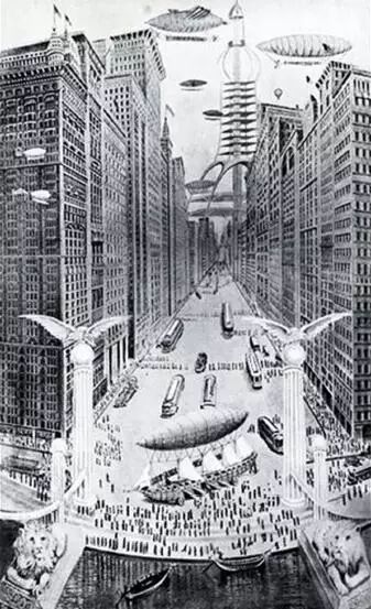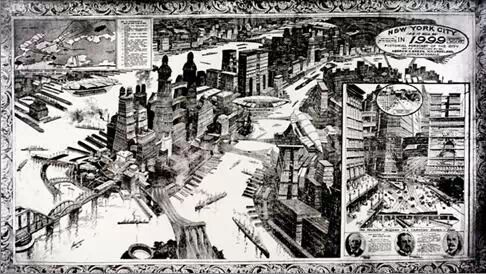大约一百年以前人们就设想过现在的纽约是什么样的,可以看到上图中在摩天楼的两边有很多高速公路,他们预计未来的交通流量非常大。
