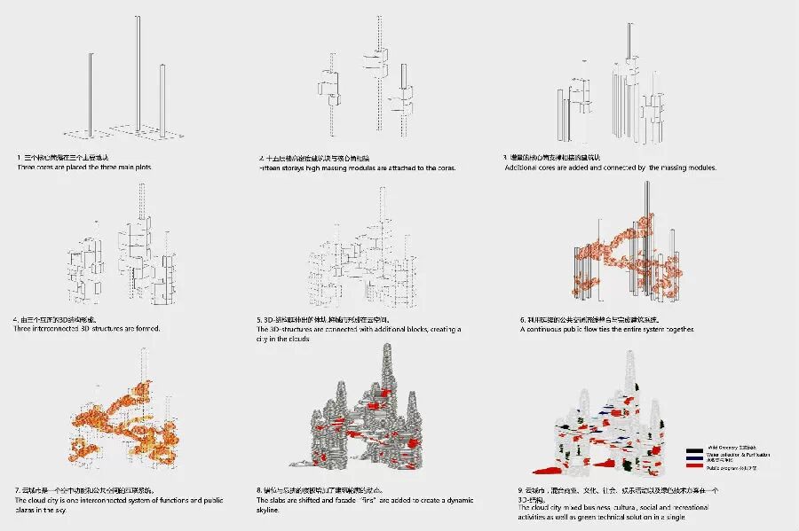这是形态生成的过程,从最早简单的核心筒,每15层的体量进行变形和穿插,互相联系起来。这张图我们在核心筒中间布置了大量的中空的我们称之为空中城市空间,像气泡或者像空中的胡同,中间是串联的。最后在串联的空间形成一个个节点,在塔楼中布置了很多文化设施、服务设施和休闲娱乐设施。