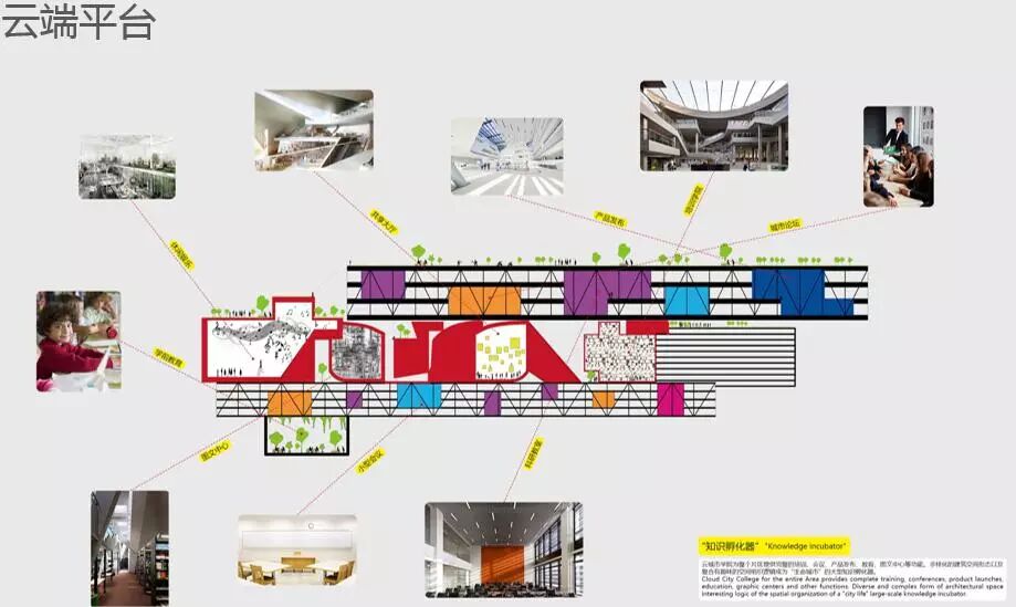 这是“空中街道”大概的剖面图,我们设想在这个里面有很多像万象城、海岸城一样的大型商业综合体,也会有一些美术馆、博物馆,我们希望地面空间有的功能这里都有。