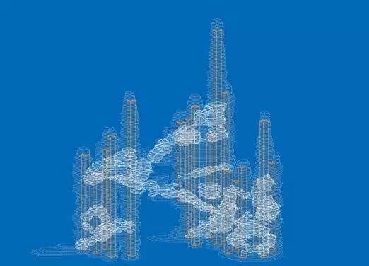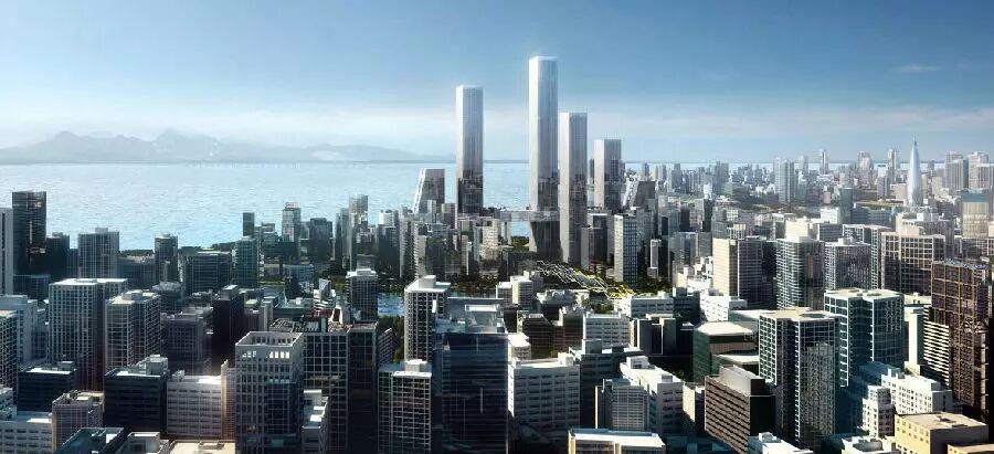 这是我们设计的一个简单的概念图。这些摩天楼在地面部分都有公共空间,主要办公空间在上面。我们就有一个想法,把地面的商业公共空间抬高到150米的高度,然后全部连起来,形成一个“空中街道”的公共空间。实际上这是一个大型的商业综合体,面向海湾,景观也非常好。