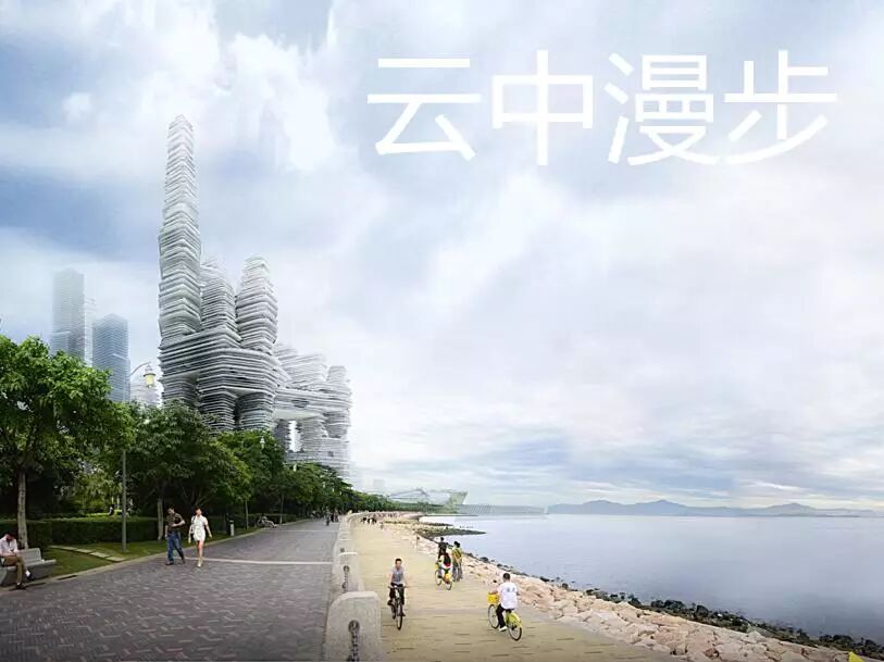我的题目叫做“云中漫步”,关于题目我们曾经有过很多想法,但我们觉得现在这个名字是比较贴切的,它表达了一个情景,这个情景是说希望通过深圳湾超级都市能够带给深圳或者普通的广大市民未来生活方式和生活姿态。