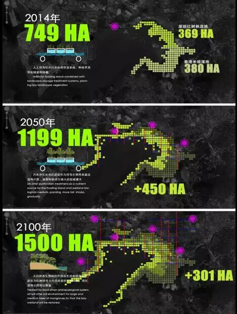 我们还有一个一百年的畅想——通过这种模式我们希望净化现有红树林的水体,通过改善湾区水体,让整个红树林湾区再扩展回来,可能一百年以后从现在的300多公顷达到1000多公顷的面积,整体形成生态湾区。