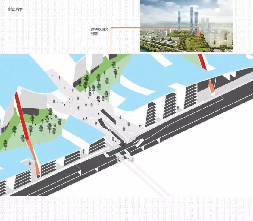 在这个位置可以看到广场和地铁是立交,本身地铁站也可以跟立体的峡谷相通,形成整个打开的区别于一般的那种地铁出入口的感受。这张图是典型的中间绿轴和中间广场地铁枢纽出入口的立体的关系,还有沿街的一个环。就不一一讲了,我们希望研究这套系统的落地性。