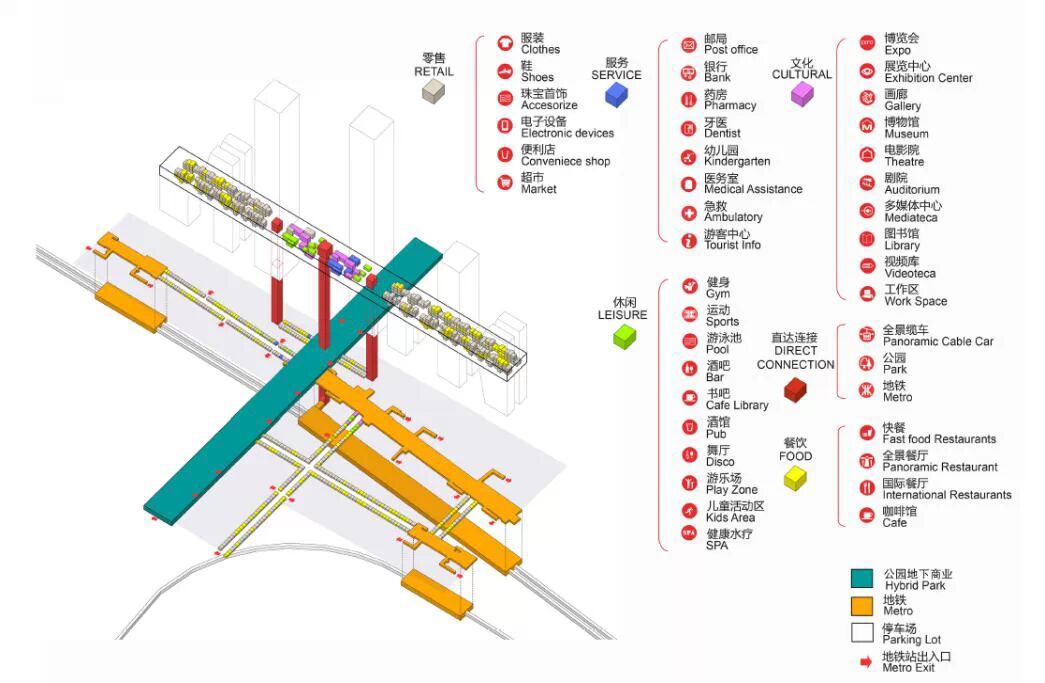 这个图是空中街道和下面公园的关系。公园也有很多商业系统,上面的是比较高档的商业系统,下面的公园跟地铁发生关系。