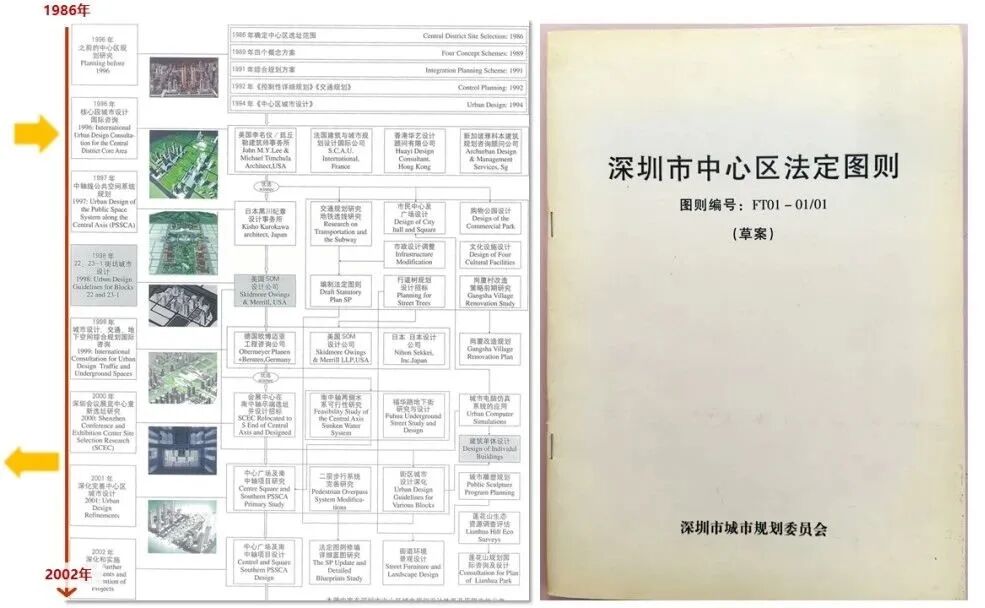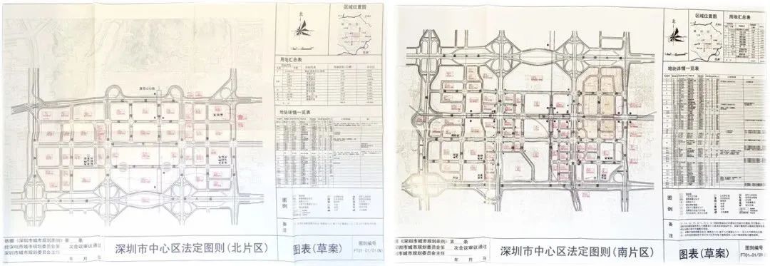 96年,我从同济硕士毕业来到深圳,《深圳市中心区法定图则》是我工作后接手的第一个大项目,也是深圳市开创法定图则制度创新的起始点,它的编号是FT01-01/01。我们在98年的时候诞生了第一版图则,现在看来十分清秀和干练,用图表把编号、功能、容积率、配套等一并概括,备注中列明权属信息和管理实施等要求。这是从香港学来的做法,以法律文书的形式把规划固化下来,这是深圳的第一次探索,对全国来说也是一次创新。