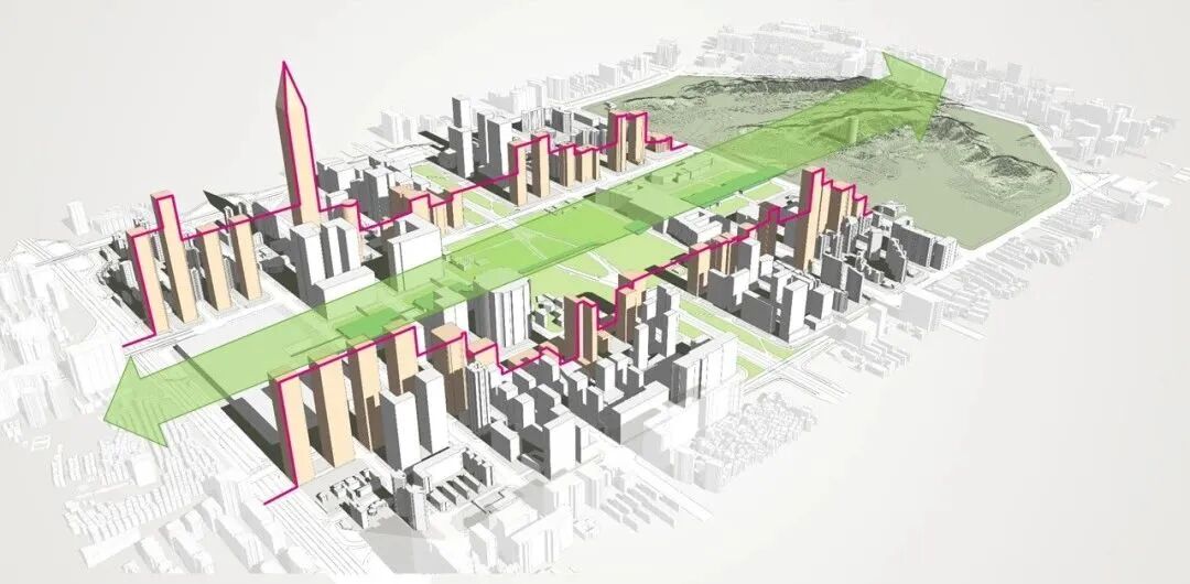 深业上城最早的一版方案,基本就完全按照通廊来考虑的,把高的房子都放在通廊的两边。我想规划初衷,是希望把莲花山顶跟笔架山顶在视线上有一个对视联系。后来我们发现,这个特定的视线通廊需要在非常特定的位置,比如在两座山山顶,才能实现它设想中的效果。实际上,我们在日常的城市地面层面,是感受不到这条视线通廊的。