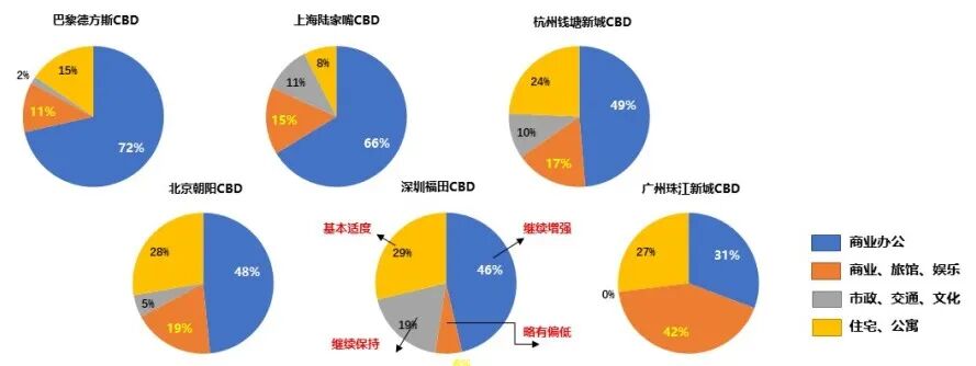 再来看里子。怎样才能叫做中心区?在陈总之前出版的一本书里,我们学习到商业办公比例预控的重要性,商业办公的规模越大,CBD的等级就越高,如果达不到这个比例,中心区就起不到该有的服务辐射作用。其次需要有综合性,中心区把行政、文化、商务、交通、公共活动五大功能合为一体,体现着开放的中心区现代化气质。