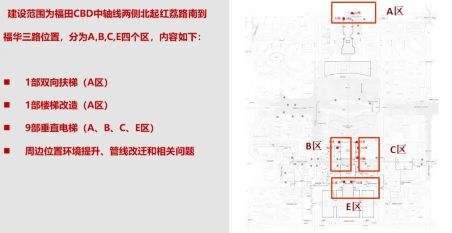 福田中心区二层连廊项目一期建设,我们是代建、实施的单位。一期需要解决的问题——先把人都带到这个平台上。于是一期主要内容就是垂直交通,增加了九部垂直梯,一部双向扶梯,一座步行梯,这些新增设施分布在皇庭广场、中心城、中心书城、莲花山的不同位置。