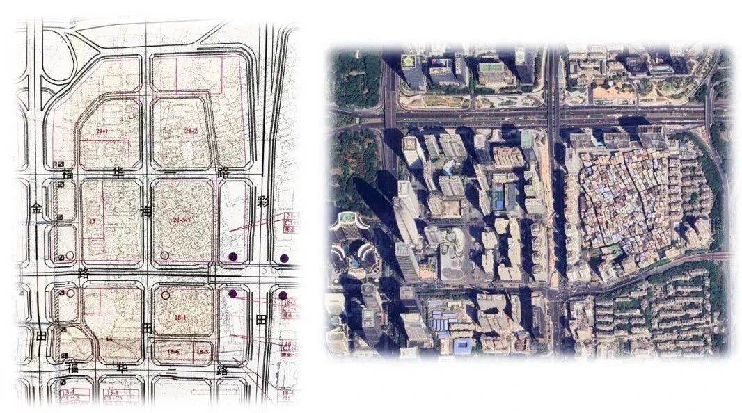 还有一些片区的变化。岗厦村在当时的规划中其实相当于开了天窗,我记得我还专门跟现在深圳大学的杨晓春教授一起进行了实地调研。那时候我们两个女孩子去村里东拍西拍,胆子还挺大,村民质问我们是干什么的!当时每家每户都在抢建加建,房子建得密不透风。下图中道路东侧是现在的岗厦村(东区),肌理上和当年没太大变化,只是靠两侧道路的外圈建高了,与道路西侧形成了鲜明的对比。这种新旧肌理的对比我觉得蛮珍贵的,展现着深圳不同阶段的历史印记,是一种有意思的形态。
