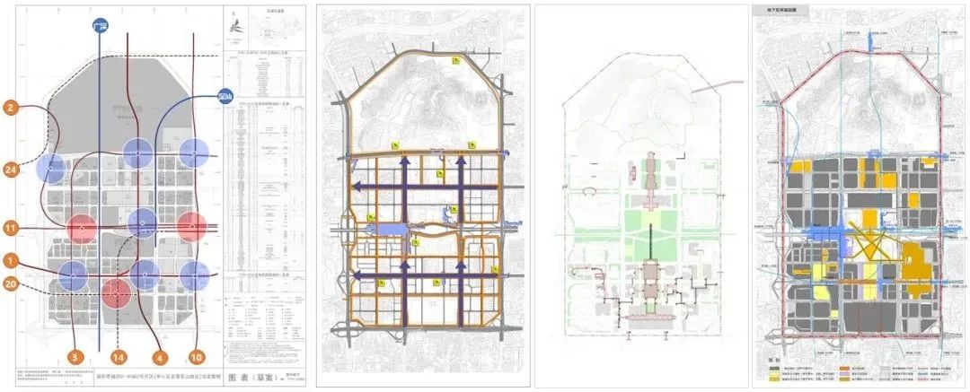 中心区经过40年的规划,30年的建设,现在不但按照规划蓝图建成了行政文化中心、商务中心和交通枢纽中心(图10),而且形成了金融产业,这里凝聚了深圳市历届领导、规划国土局几代同仁和国内外专家、设计师的辛勤汗水和智慧远见。这里面故事很多,今天重点讲几个故事。
