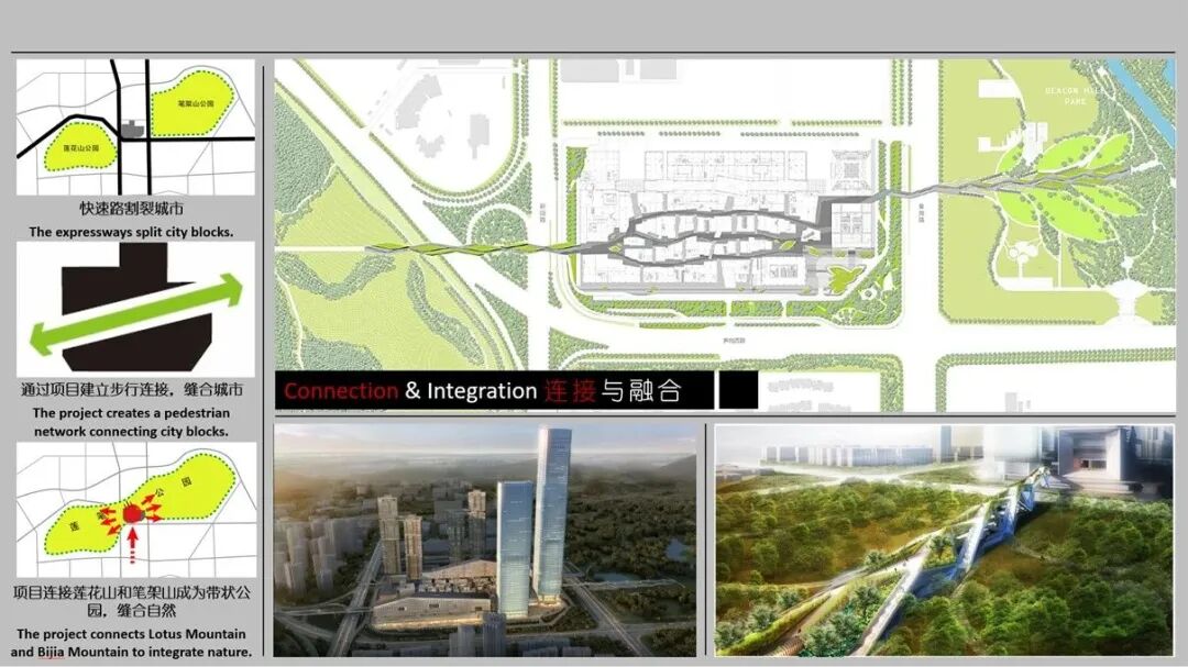 我们当时设想把深业上城的两座桥搭起来之后,可以让中心区轴线一直往北延伸,跨过莲花山,连到深业上城和笔架山,再继续做其他有可能的连接,例如再继续向北连到银湖山。