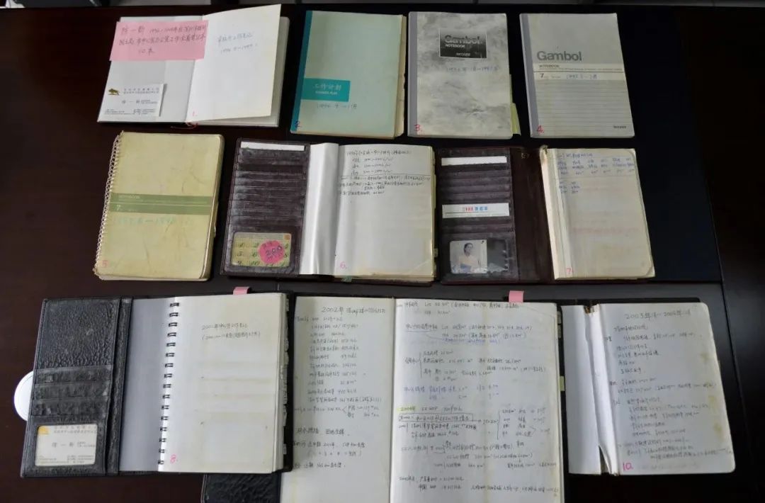 这是1980年的中心区原貌(图2),可以看到深南大道的土路已经有了,有岗厦村、莲花山、河流、鱼塘、荔枝林等。从1990年成立福田区,到1995年(图3),整个福田区外围几乎建满了,但中心区最后留下来了。深圳市政府和我们规划国土局一直坚持“先外围、后中央”的建设原则,把土地价值最高的地块留到最后来建设。这是历届领导的高瞻远瞩的结果。1996年市规划国土局成立中心区办公室,当时有我和黄伟文、朱闻博、沈葆久这四个人。1996年中心区仅有这几栋大楼,中银花园、关山月美术馆、儿童医院、投资大厦、邮电信息枢纽中心、机电设备安装公司家属宿舍、皇岗中学,还是深圳最佳“练车场”。2020年正值福田区成立30周年,区档案馆领导来找我,说我是当年中心办负责人,是否可以提供一些实物来印证中心区从无到有的历史。我找到了自己在中心办工作期间的十本笔记本(图4)。还有中心区从1999年到2023年在莲花山顶定点拍摄的连续照片“成长册”(图5-9)。
