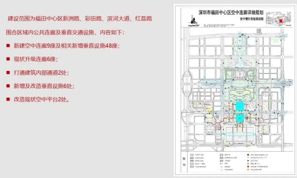 二期建设,就是真刀真枪要去做连廊了,需要新建9座连廊,新增48座垂直设施;其次是现状升级连廊6座;其三是打通建筑内部通道2处,这个有可能是原来规划的时候,要让建筑本身预留一个公共的通道,但是因为连廊一直没连上去,那个通道就变成其他功能了,现在要把它恢复;其四是新增及改造垂直设施6处;其五是改造现状空中平台2处。