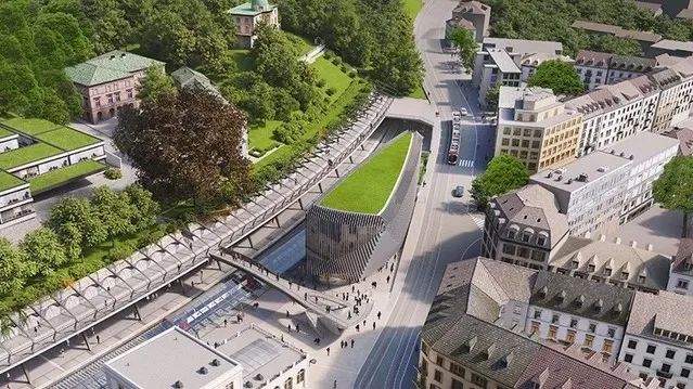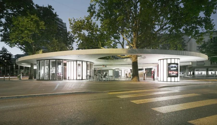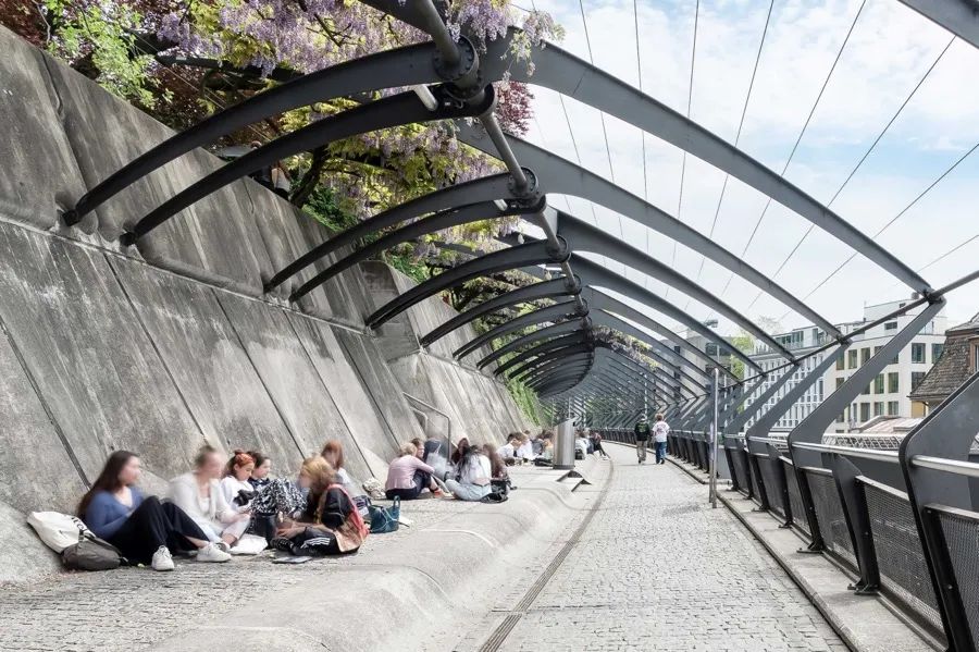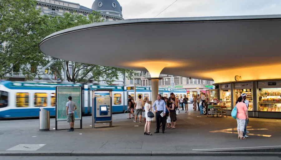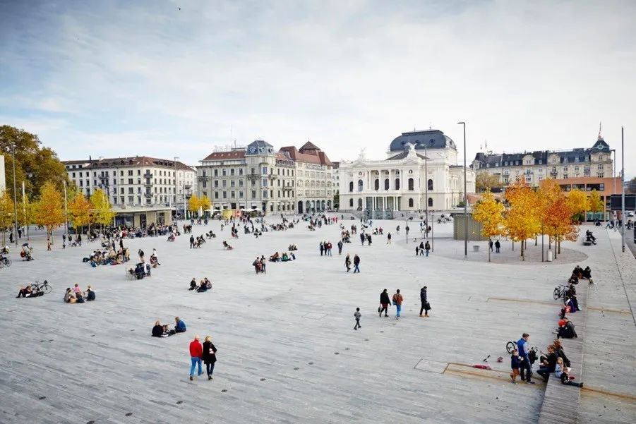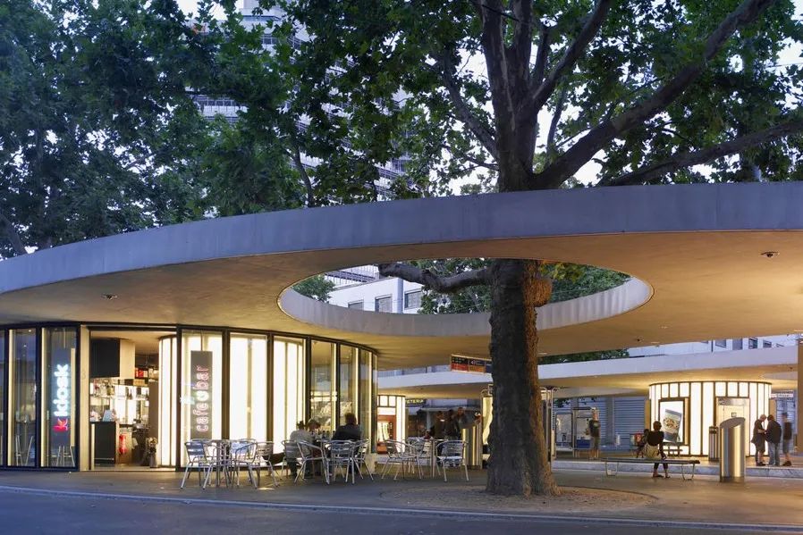 广场尽端还有一个轻轨公交车站,叫做Bellevue,也就是英文的 beautiful viewpoint(美好的观景点),是城市里人流量最大的车站之一,建筑和结构上都很有想法。除了这个车站,整个苏黎世的公交车站组成了风景线的网络。比如 Limmatplatz 站,让场地的树木成为车站的主题和市民记忆的延续。