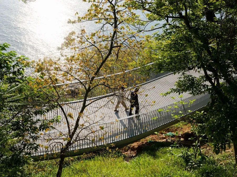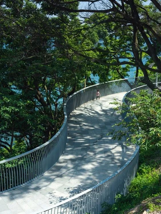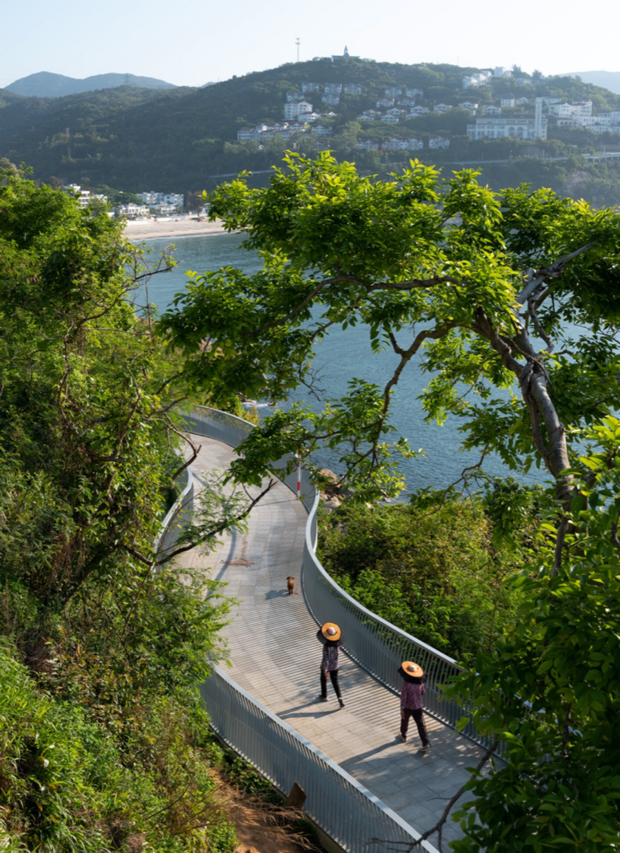在上空,我们看到步道有时穿行在树林之间,有时候来到开阔的海域,附近村民也会带着小狗来散步。无论是做了哪些工程师的工作、哪些关于美学的工作,最后把这个空间还给市民,成为生活的背景,就是我们希望能达到的工作状态。