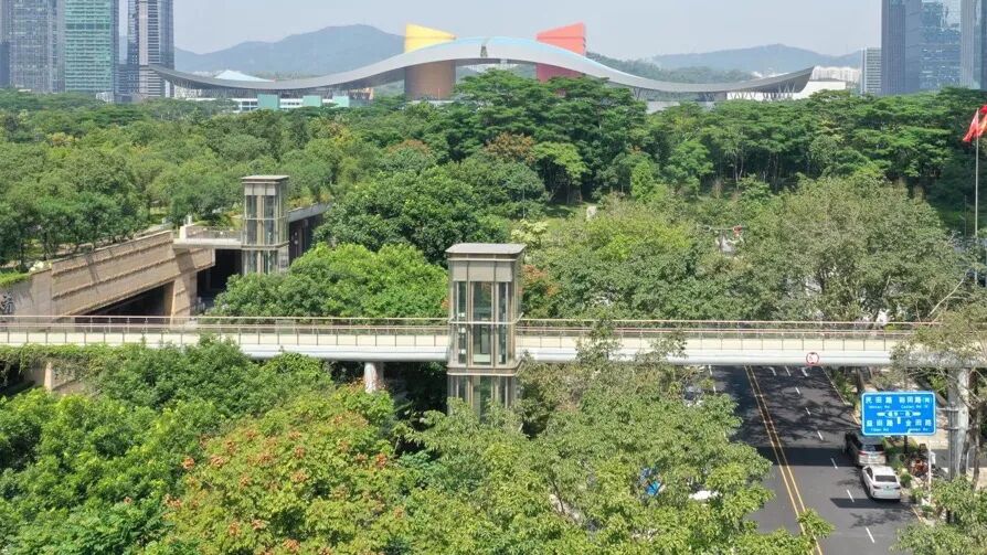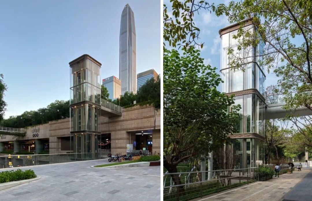 2017年我们来到了深圳。这是我们主笔的第一个项目,将现存的开放式剧场改造成为室内剧院,现在已经开放使用大概有两年的时间。第二个项目我们就参与到了城市基础设施的建设。福田中心区有一片像纽约中央公园一样的绿地,但它在地上二层,本意是连桥从周边的高层裙房连接到过来,但因为运营的原因高层建筑都封住了连桥。通过针灸式的落点,我们让市民可以乘坐电梯从街道上来到屋顶的花园。这也是我们的第一个建筑「产品」项目,第一次应用正向BIM来把多个电梯单体分解为各个模块,再通过排列组合形成集群。