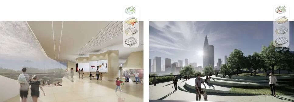 变电站内设置有全天候开放的“游乐设施”。从首层可以一直步行至屋顶层,在三层的区域做了一个展厅,让公众近距离接触变电站,观看、参观、游玩,也是远眺深圳湾的观景之地。