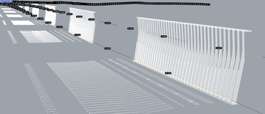 做建筑产品,和设计常规项目很不一样。我们须要在工厂指导打样,而传统的工厂虽生产环节成熟,但技术上需要建筑师协助提升。工厂不熟悉的参数化加工,我们自己去写代码,最终任意弧度的栏杆都可以自动生成拍平的平面图,在厂内将几十万片钢片激光切割后组装,数公里长的几千段栏杆便一次性解决。