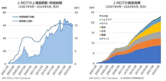 制度形成以后投资法人数量不断增长,2001年以后到现在一共有60多家准备上市的独资投资法人。我们也跟一些地方领导交流,中国也有类似的体系。但日本不同的是,早期专注于办公,后来也在商业、住宅、物流、酒店、康养设施等等这些非常丰富的领域。整个规模达到20兆亿元,现在还在不断上升的过程。
