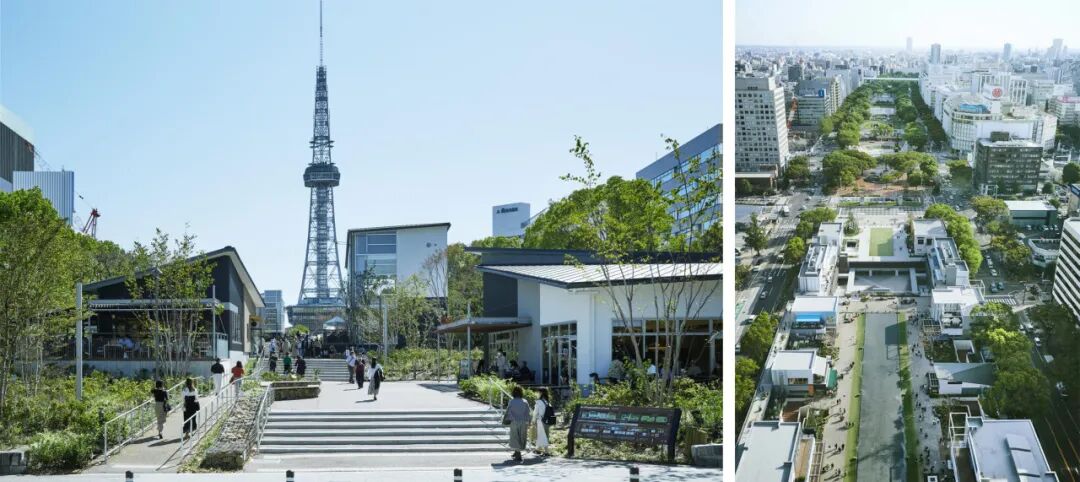 以名古屋的久屋大通公园的改造为例。从改造前图片看上去绿意盎然,但是还存在道路高差、气候炎热,乔木和灌木遮挡视线等问题。改造一方面对于公园整体骨架进行梳理,植入一部分商业设施,同时对景观的水景、铺地、绿化进行提升。现在久屋大通公园已经成为网红地。