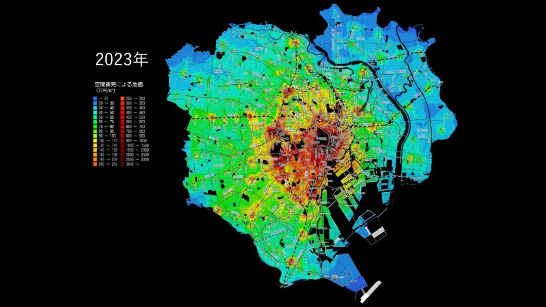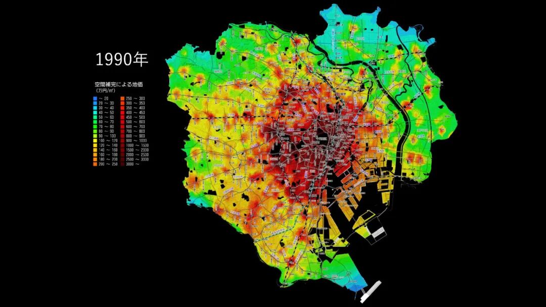 回到本次讲座的主题,从1990年的东京地价分布图上可以看到,越红的地方代表地价越高,绿色和湖蓝色的地方代表地价越低。众所周知政策上的原因导致日本经济泡沫,地价迅速递减,每年地价高的红色区域不断缩小。大概持续了十年以后在2000年地价触底,2008年雷曼金融危机以后一段时间下沉,之后又开始不断增长。