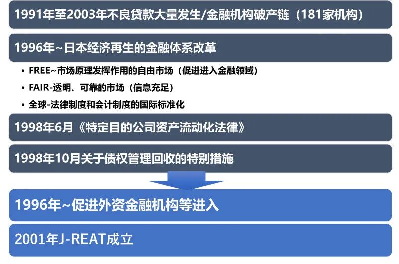 这个改革带来的直接影响,从数据上看,2000年以后东京都的外企急剧增长。这个房地产证券化尤其是信托领域的J-REITs独资法人,它的机制做得很简单,通过独资法人购买,然后再把它交给专业的资产运营公司进行运营,这些集资可以像证券一样去市场交易,这些投资家、金融机构就可以像购买股票一样购买它,然后有自己的收益。