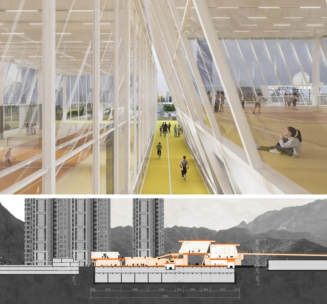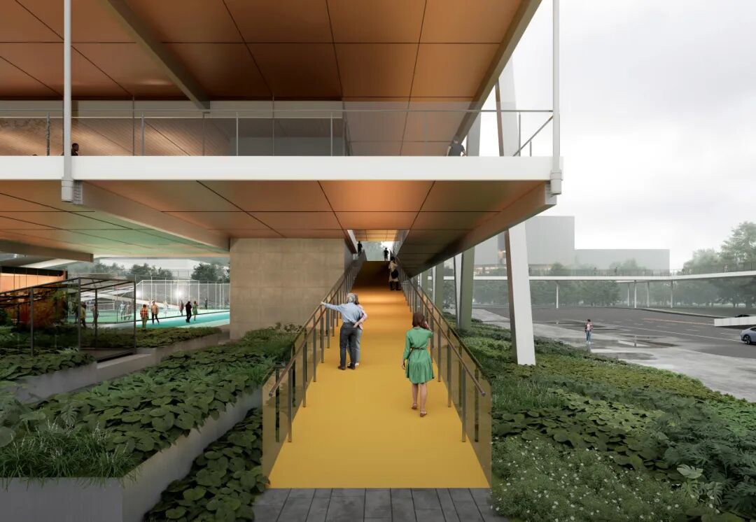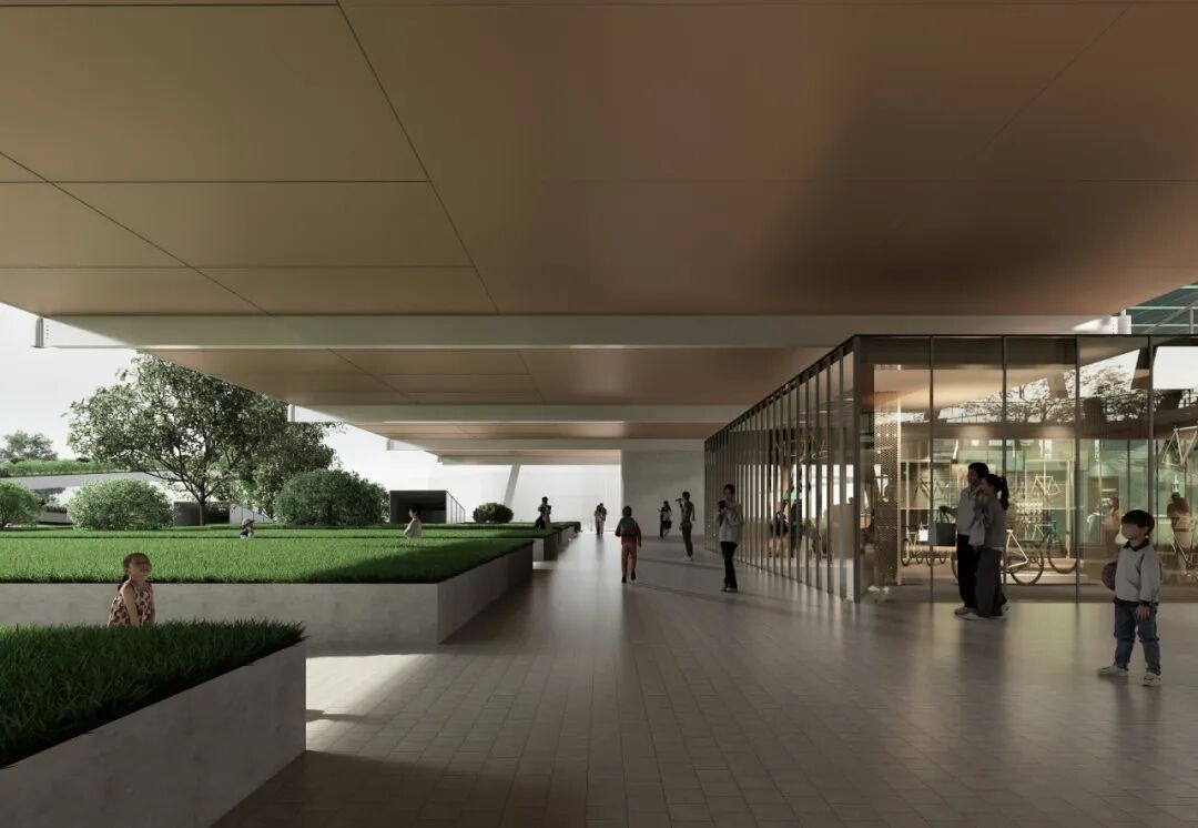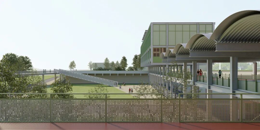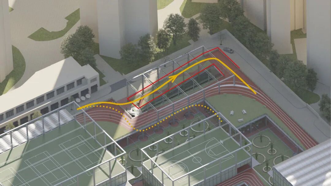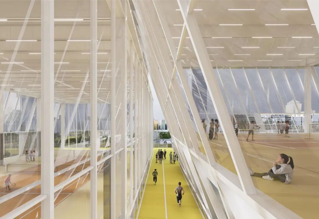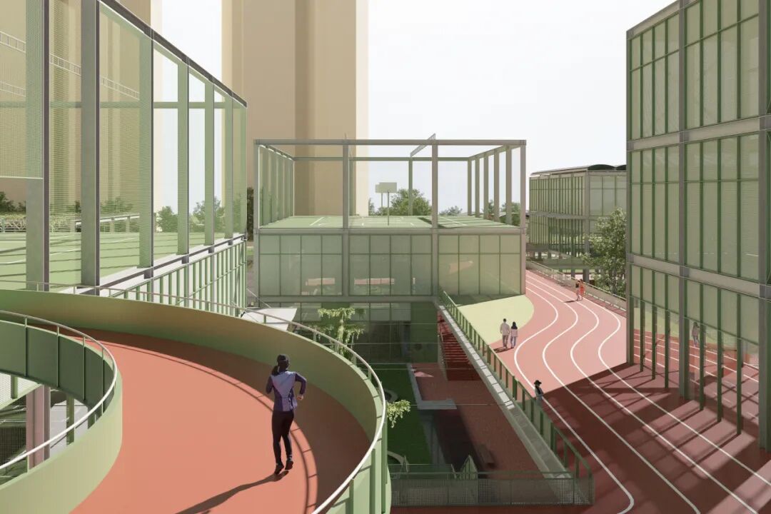 贯穿全场的跑道游廊预留了与上盖公园及滨水公园的衔接点。人们可在不同标高中自由穿行、慢跑或停留,体验从局部到整体的空间连续性与开放性。