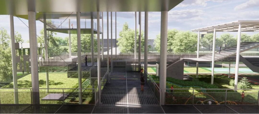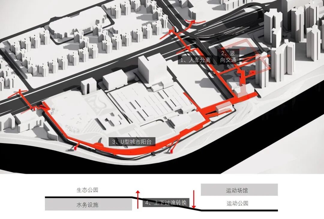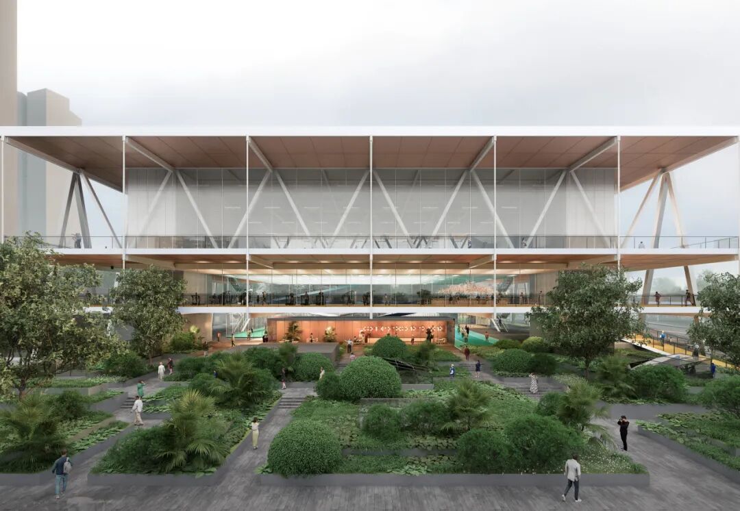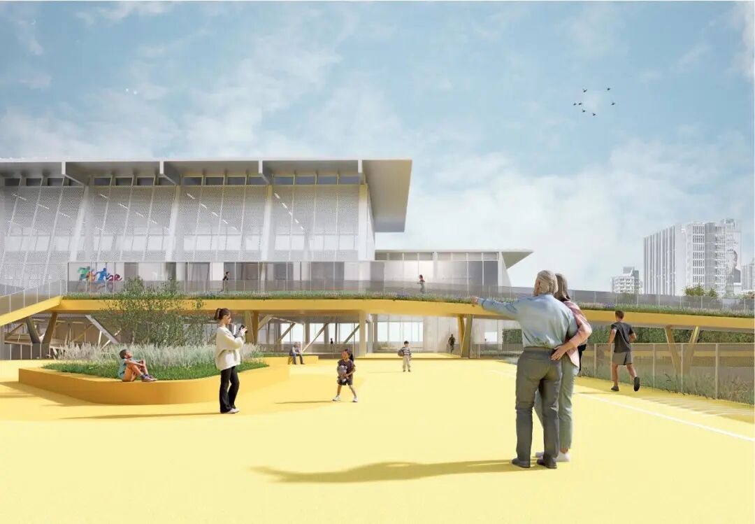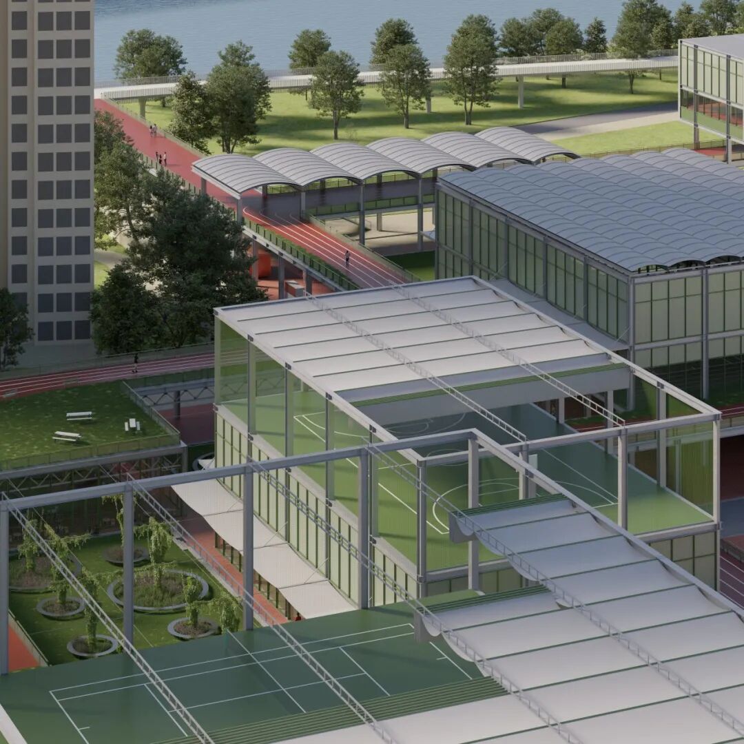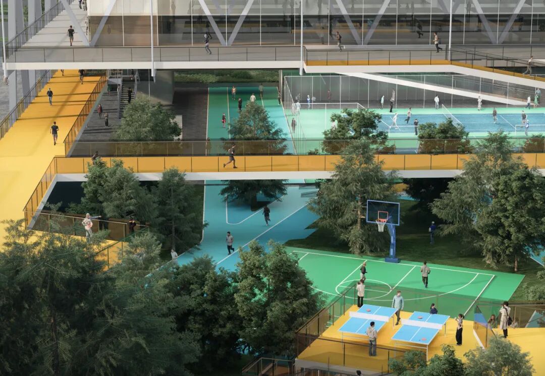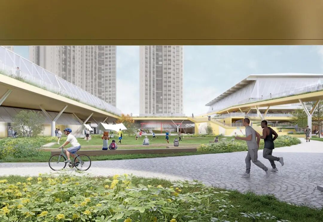 贯穿全场的跑道游廊预留了与上盖公园及滨水公园的衔接点。人们可在不同标高中自由穿行、慢跑或停留,体验从局部到整体的空间连续性与开放性。
