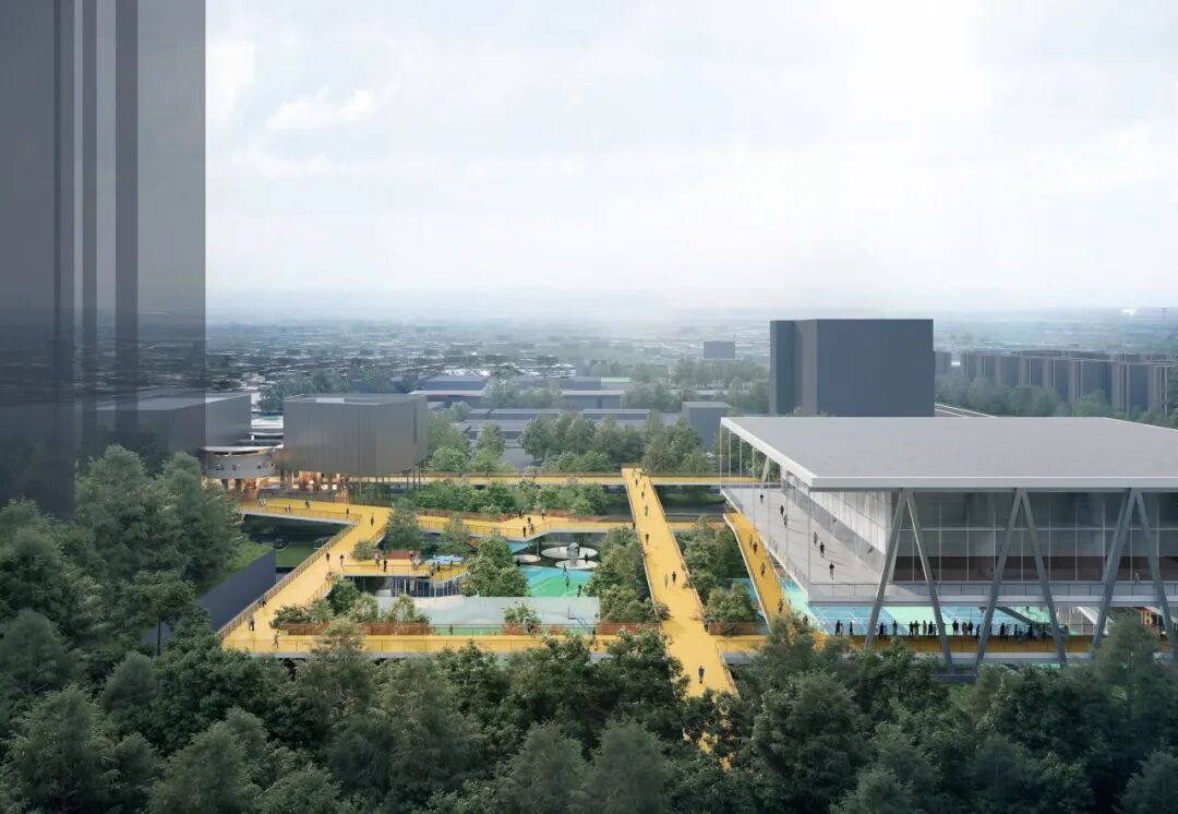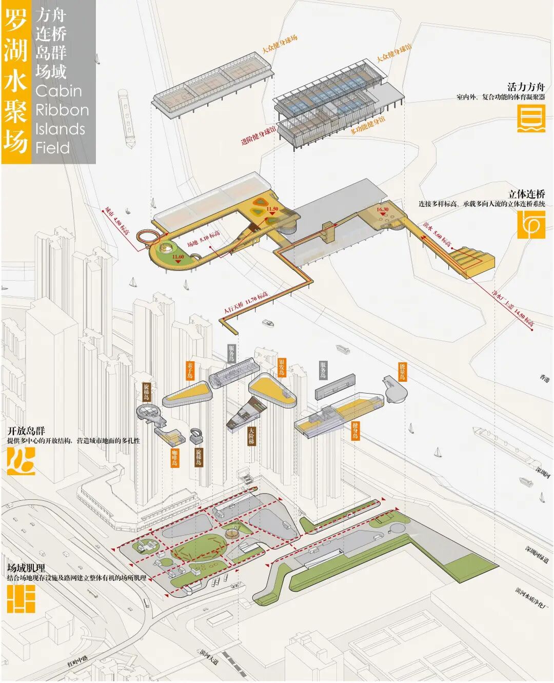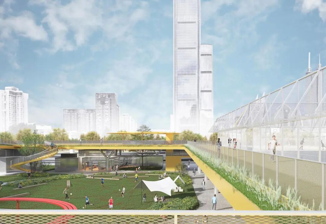 三、立体连桥——建立连接多节点承载多种人流的立体连桥系统。A区以6米标高环形慢跑道为主,东侧衔接地铁站人流,南侧提供运动区之间的休息平台并以大台阶衔接一层绿地。B区以穿越运动馆之间的空间轴线及眺望香港的深港大阳台为主,南端连接未来滨河净水厂上盖公园,北端通过延长人行天桥衔接北侧城市人流。