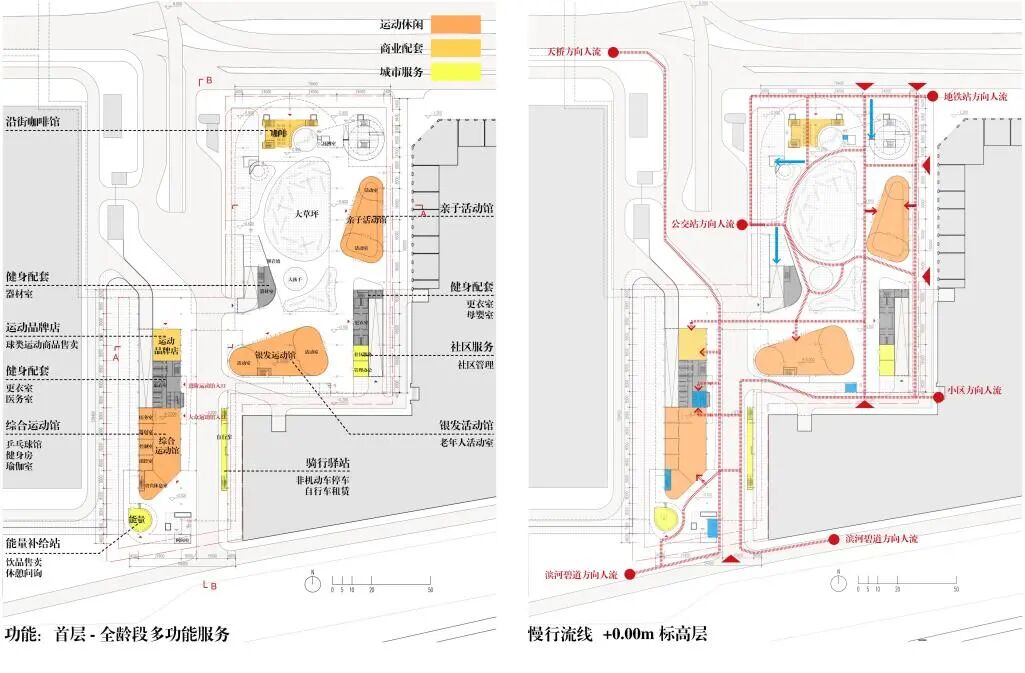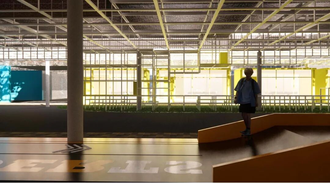 连桥之下为开放场地。功能配置全年龄段、多功能、灵活可变,可以应对未来多样的运营需求。一层的流线是漫游式的,不同人群都自由可以进入场地。
