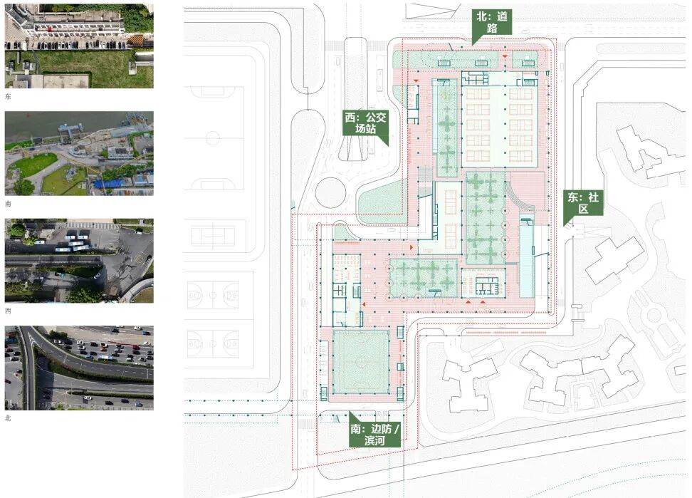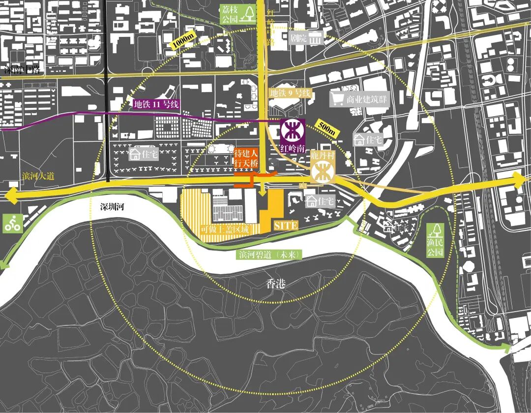 另一方面,现状场地交通条件复杂,涉及多种流线的交错,但滨河大道的横亘造成了场地与北侧城市人行空间上的割裂。然而,未来的滨河水质净化厂上盖公园与深圳河碧道规划,带来了将其转变为区域公共空间纽带的绝佳机遇。现状场地界面体现多面差异性,东侧是住宅小区,北侧是快速的滨河大道,西侧紧邻水厂围墙,南端面向香港。如何回应不同的界面,使得全龄化不同需求的人群能够便捷到达场地,使得多样化的活动能够自然发生,是我们考虑的另外一个点。
