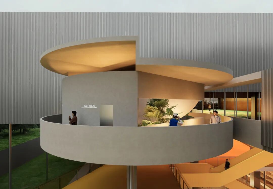 设计对场地设施采取了整合与美化并重的策略。利用二层连桥6米的层高覆盖设施集中区,并将其与“岛群”体量相结合进行改造,例如在衔接一、二层的环形坡道处,嵌入结合楼梯的“咖啡岛”。针对异味处理,我们利用6米层高与底层4米高设施构筑物之间的2米高差,设置通风井道,形成有效的空气隔离层,从而保障了公共空间的舒适体验。