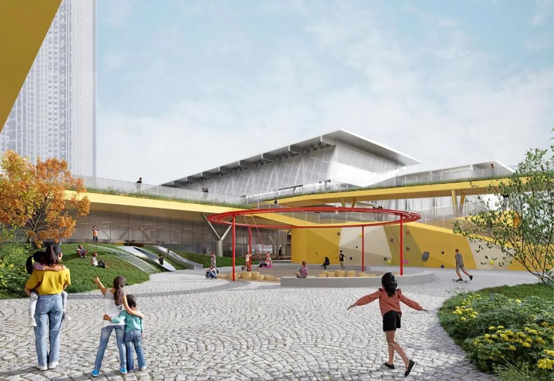 中心空地是微微地形起伏的公园,公园针对不同年龄段划分不同的区域,并与相邻的底层多功能体量有所借用关系。
