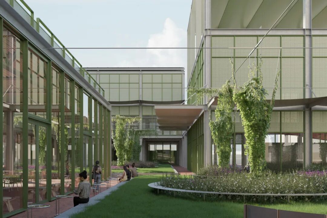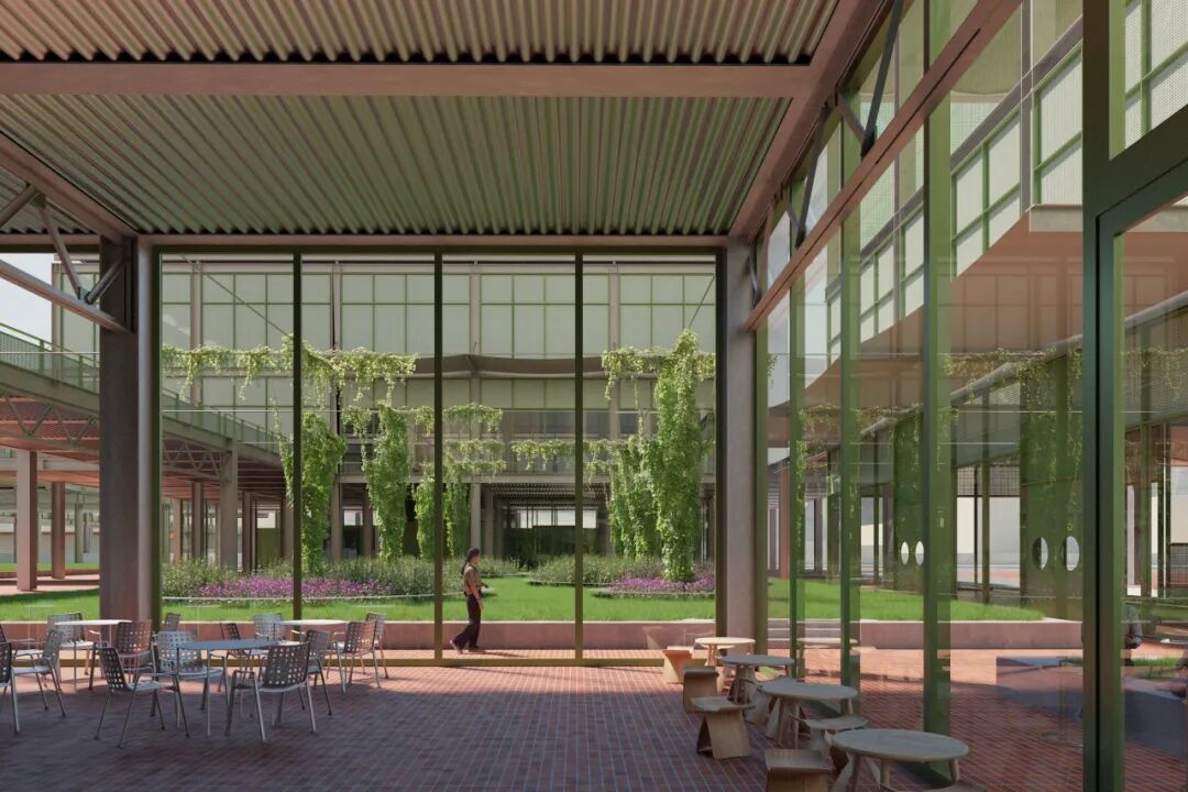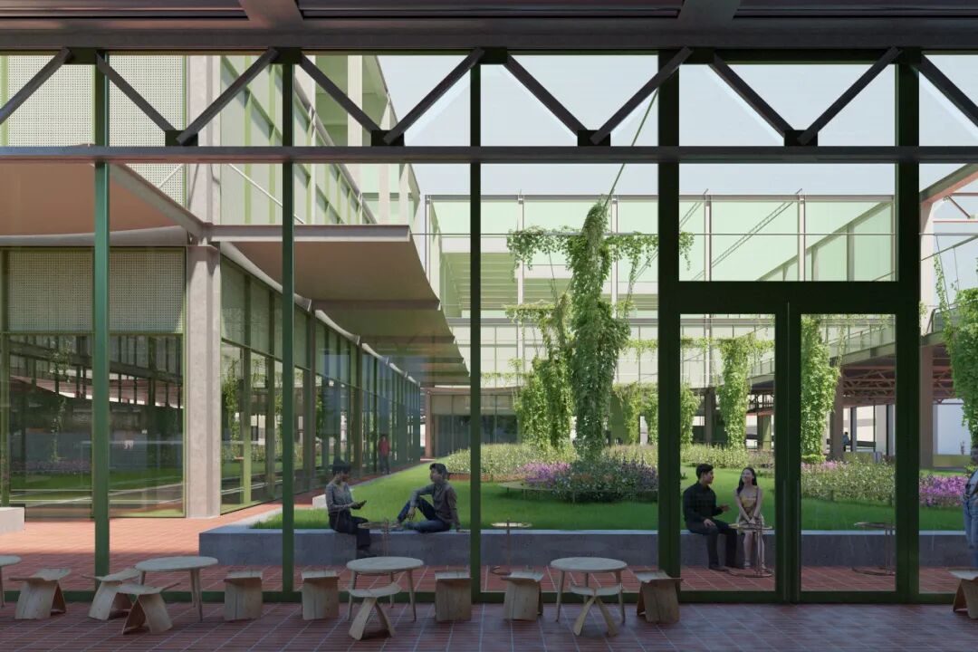在城市设计层面,我们重点思考的是方案如何回应未来城市愿景。我们采用“网格式廊道+院落”的灵活布局,将未来西侧的上盖公园、南侧的滨水公园等宏大的城市空间与场地内部琐碎的现实条件有机编织在一起,既保证整体的开放性,又保留细腻的空间层次。