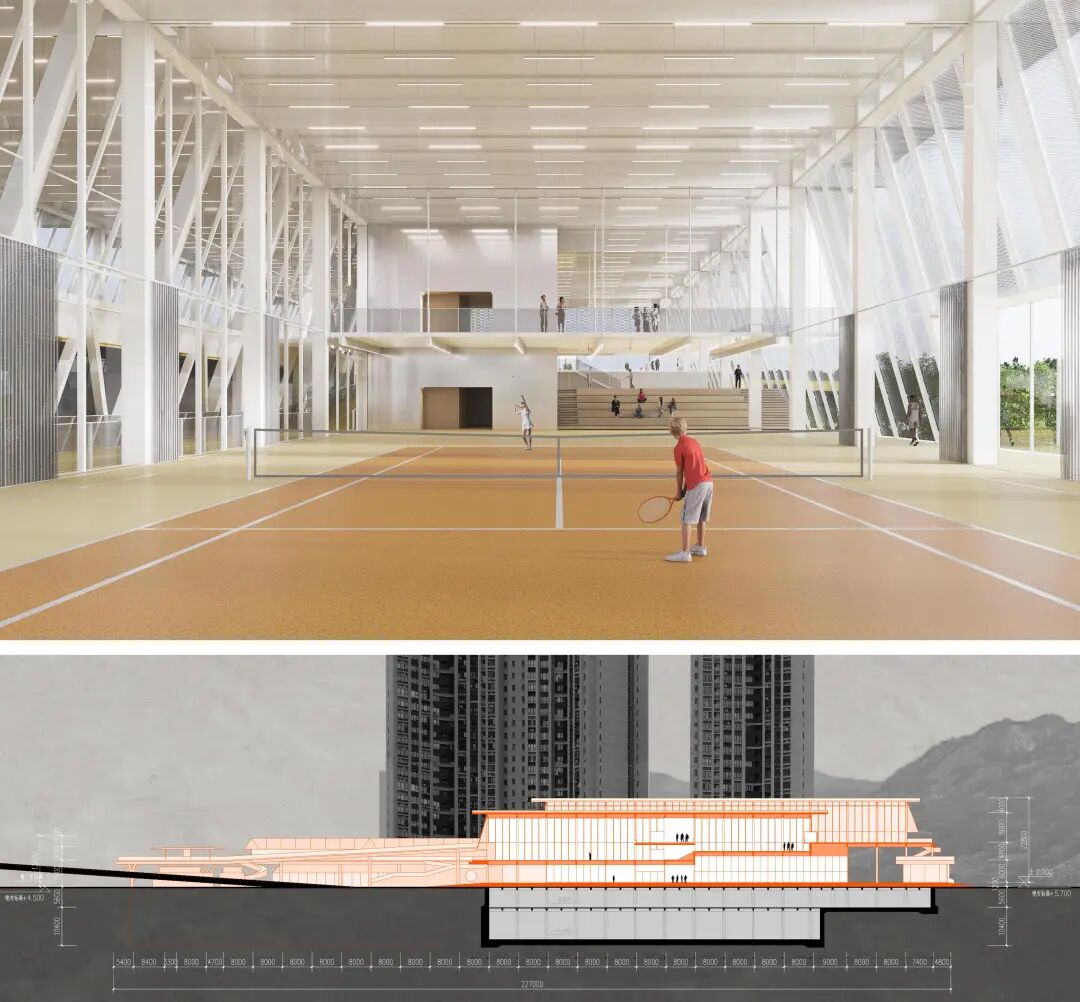 通过剖面图来看,进阶球馆内部设置空间立体组合。结合网球、羽毛球的不同层高要求,两者之间的高差形成了观众可以观摩的看台区域。上部下挂体量是大众羽毛球馆门厅,这个门厅也可与进阶馆活动产生视线上的互动。