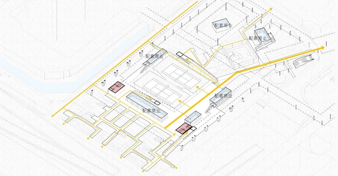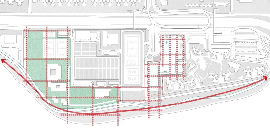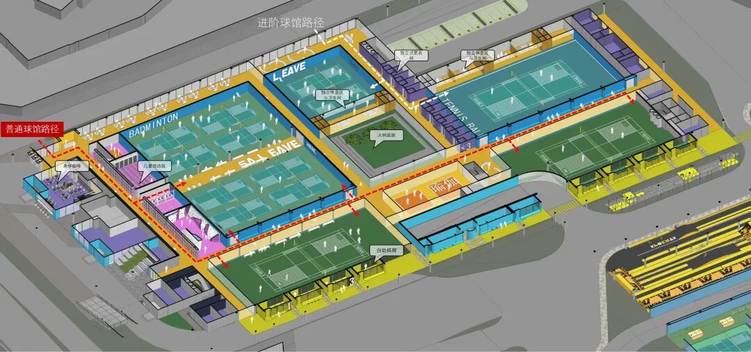 室内场馆延续规划逻辑,通过纵横交错路径分布植入球馆空间。从布置逻辑来看,横向流线上布置的都是服务空间,纵向的几条轴线都是休闲和休憩空间。