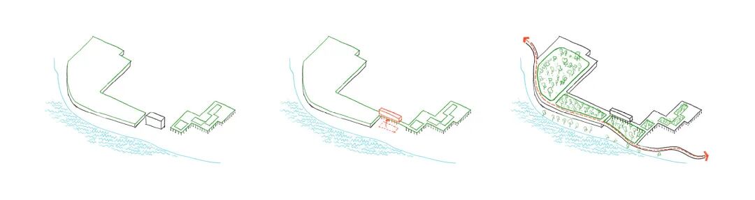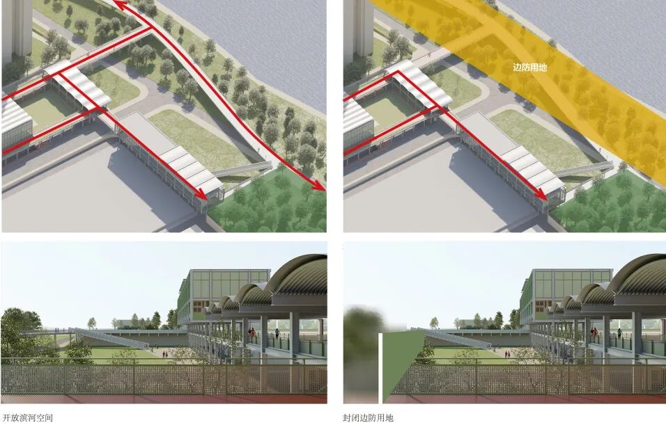 在整体慢行系统的构思中,我们将西侧地块规划中的技术楼纳入整体构想,建议将其北移并架空至三层,在改善办公品质的同时,实现二层步道与上盖公园的无缝衔接。南侧形成围合院落,柔化边防用地的生硬边界,构成市民可自由活动的滨水广场。