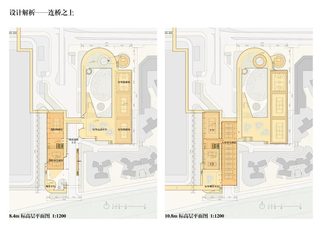 我们希望在标高6米的高度加入连廊体系,形成从北到南、从天桥到A、B场馆、再到上盖的连续立体交通,优化地面比较复杂的车行路径,实现人车分流,同时解决自下而上不同标高的问题。