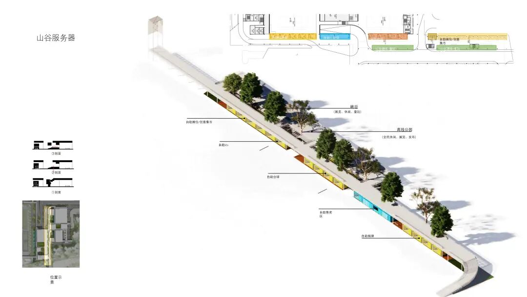 除了二层 “高线公园”的大平台,还有一些跌落的“山谷”空间,“山谷”底部配合功能盒子,功能盒子里可以植入自助棋牌、自助售卖、自助台球、KTV,甚至于创意集市等等。