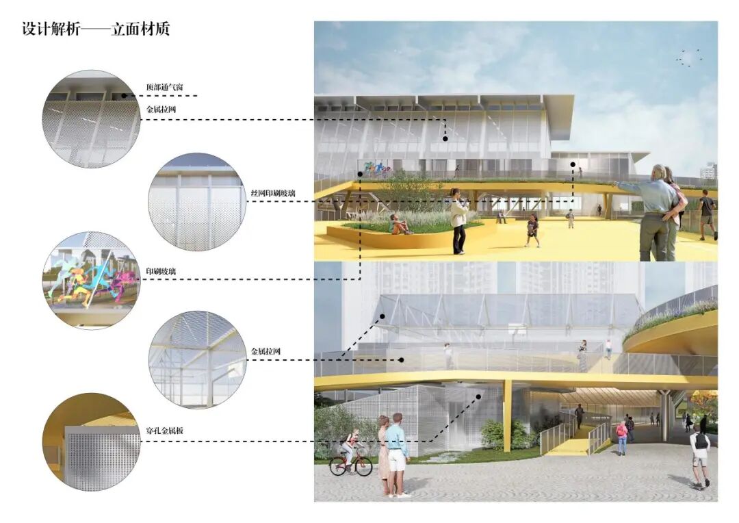 立面材料,选择玻璃幕墙营造通透开放的场景,为了防鸟撞以及遮阳,用金属拉延网来做立面,在顶部设置开气扇,对现状设施用穿孔板进行整合,保障散热通风。