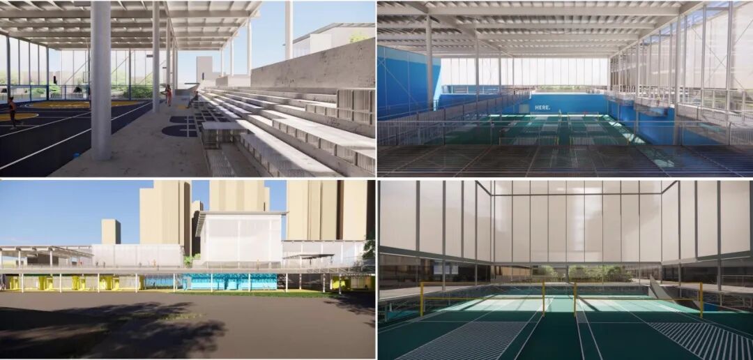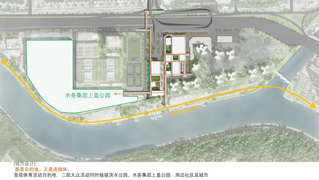 我们的方案“水聚院”,旨在打破传统体育设施的封闭模式,使其与街道、花园、广场共同编织成一个开放且充满活力的城市公共空间系统。我们希望它不仅是一个社区邻里相聚的“院子”,更是精彩生活不断上演的滨水城市“剧院”。