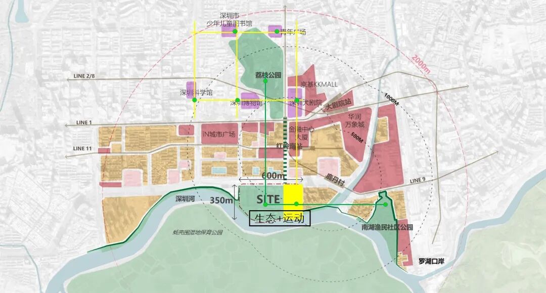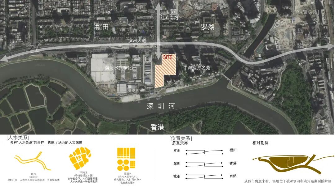 深圳的滨水景观资源由西向东逐渐萎缩,来到深圳河,岸线被大量建筑围堵,场地是为数不多以面域贴临滨水景观的区域。