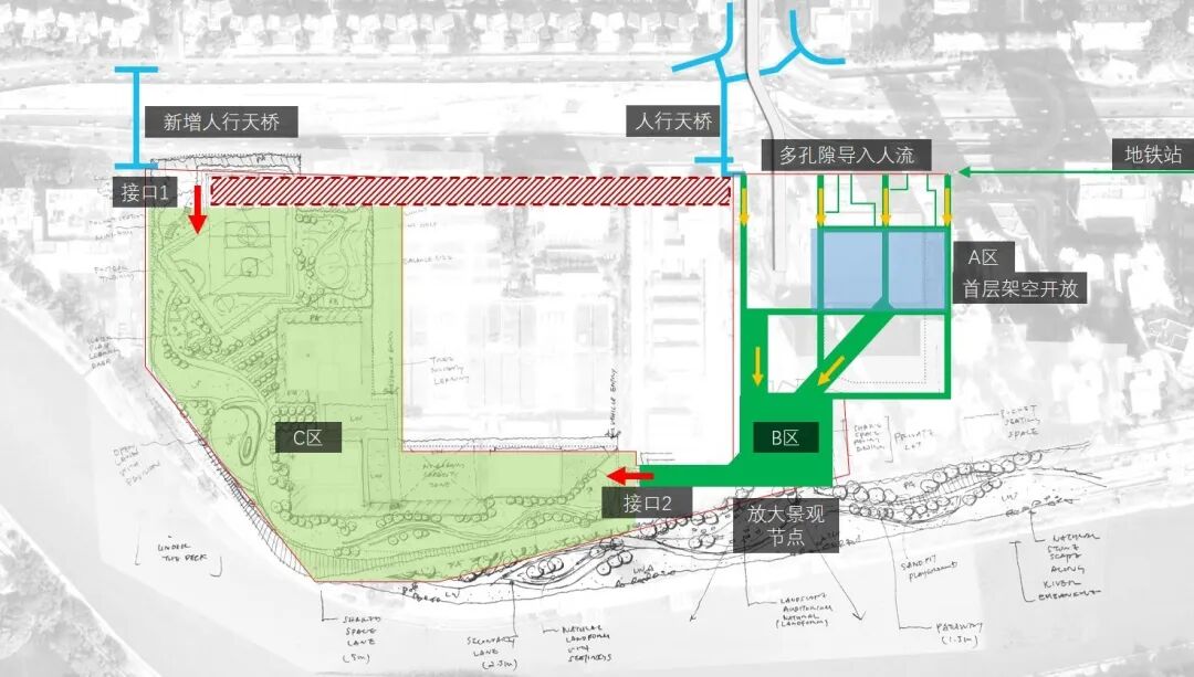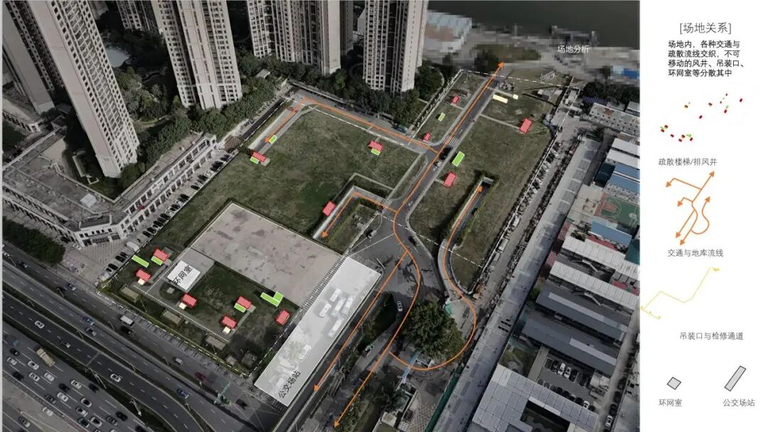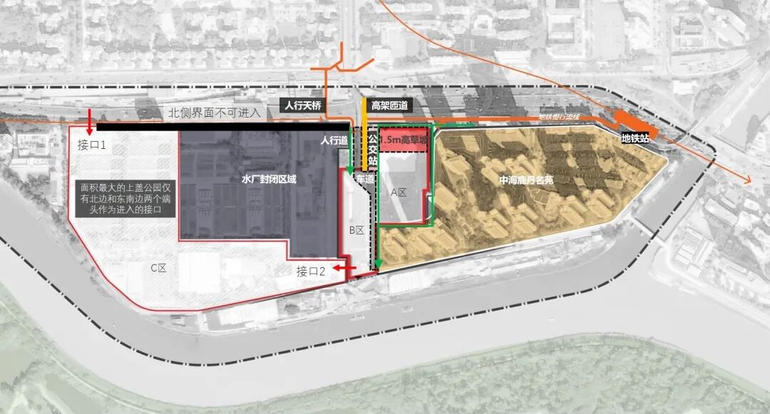 场地的可达性较差,北侧紧邻城市的界面被厂区、匝道、公交站等市政设施占据,而上盖区域只有两个尽端接口,解决可达性是实现项目公共性的关键。