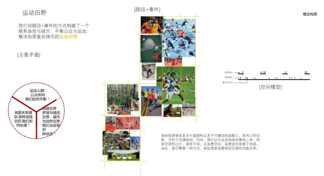 这块地非常复杂,边界问题、场所问题、结构问题,各种问题林立。我们希望以“运动田野”的方式来解决一个更为重要的问题——即“公共人群”与“运动人群”之间的相互关系。